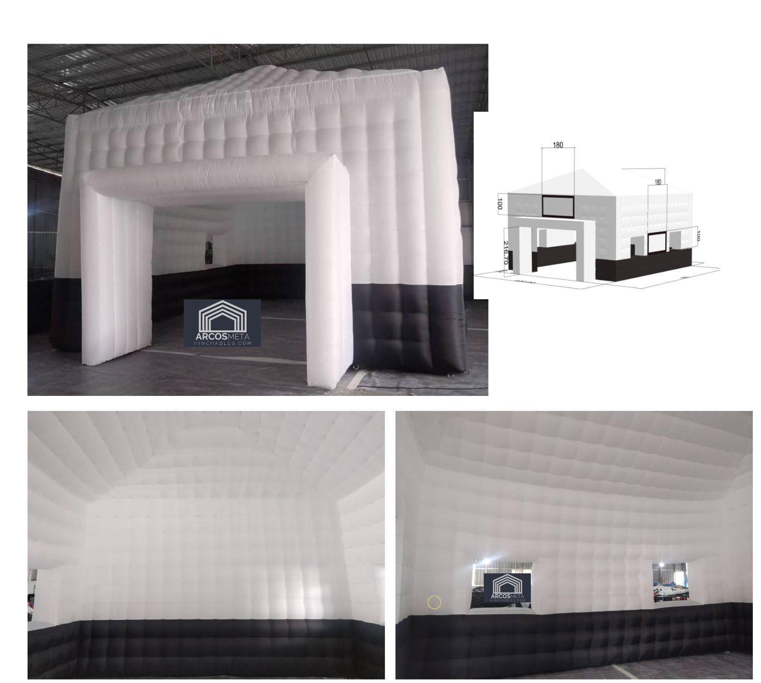 Carpa araña o spider con pilares inflables, tejido inífugo. Incorpora motor de inflado eléctrico. Se puede fabricar en varios tamaños. Totalmente personalizables.